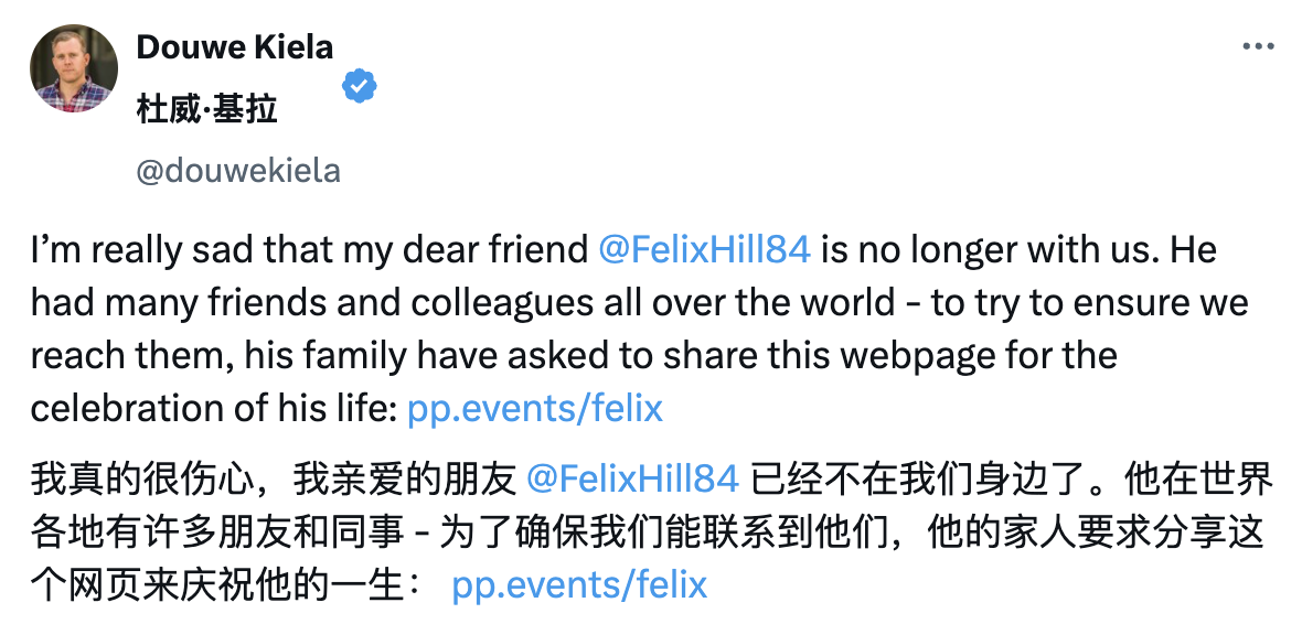 即便是未曾谋面的同行也为其所折服。英伟达高级研究科学家 Jim Fan 今天也在 X 平台转发 Felix Hill 博客,并借此缅怀这位朋友。