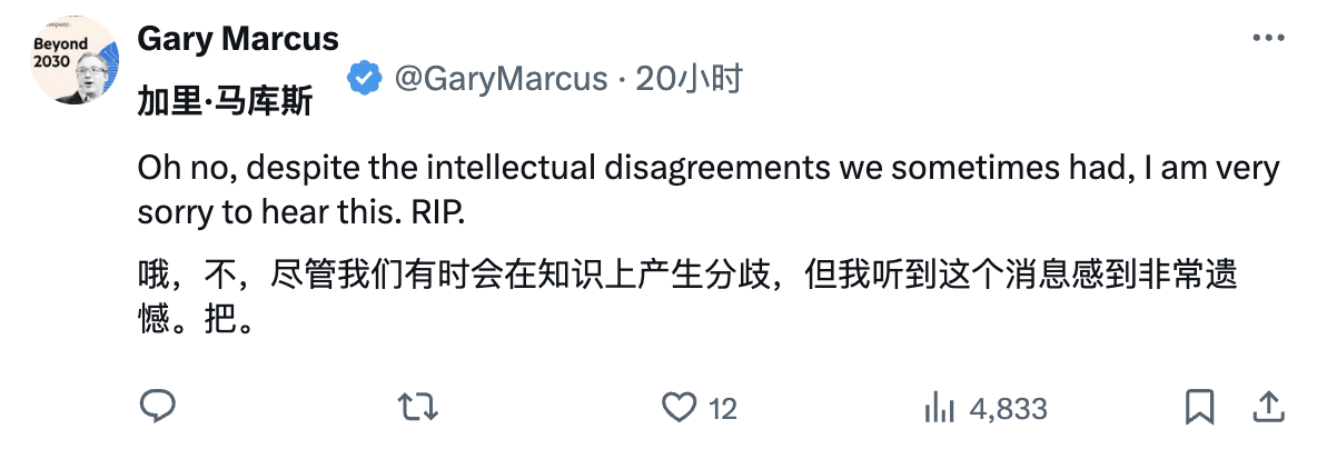 尽管我们有时会在知识层面产生分歧,但听到这个消息我感到非常遗憾。愿他安息。