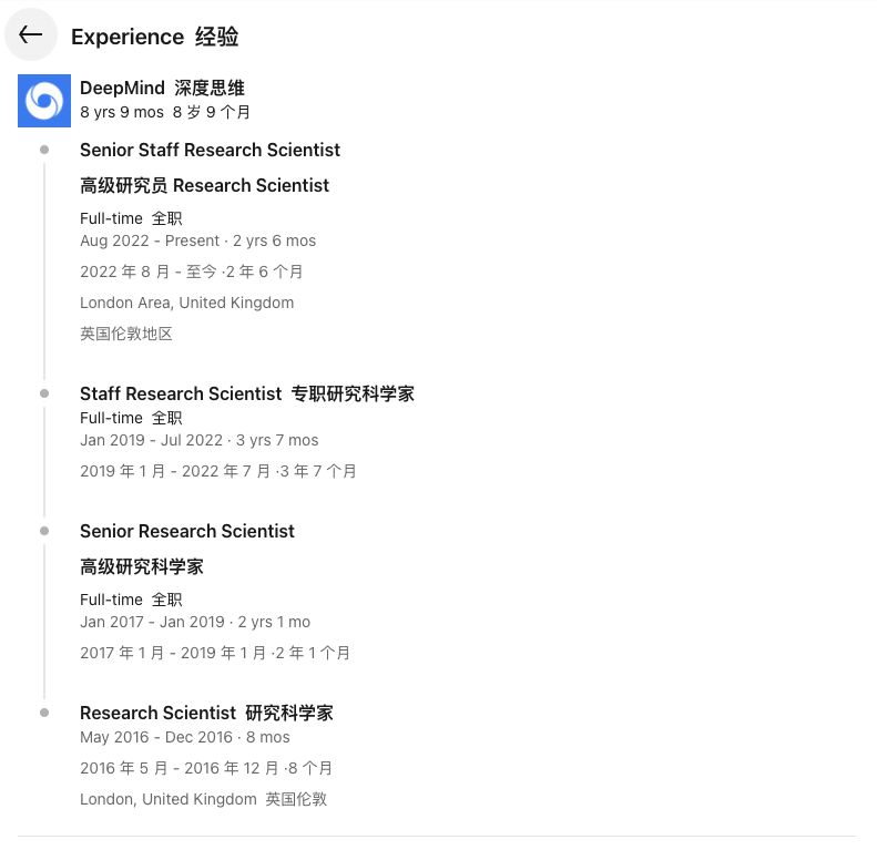 在离世前,他在 Deepmind 主要负责领导着一个研究语言与通用智能交互的团队。与此同时,他也开始将重心转向前沿科技研究,专注于语言学、机器学习和 AI 模型开发。