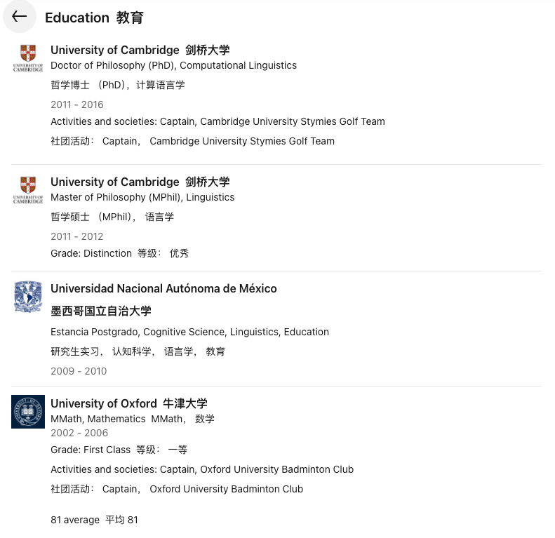 他本科毕业于牛津大学的数学专业,也曾担任牛津大学羽毛球队队长。研究生实习则在墨西哥国立自治大学,专业方向是认知科学、语言学和教育,专注于多学科交叉领域(认知科学和语言学)。
